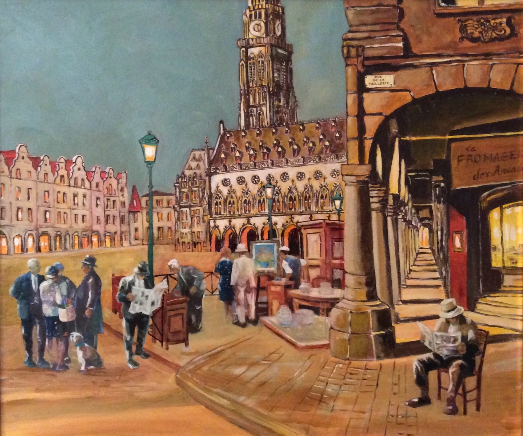 Très joli. Même groupe en discussion, même lecteur de journal, même cycliste ! On retrouve les mêmes personnages d'une oeuvre à l'autre. Une sorte de fil rouge ;-) Peut-on avoir quelques précisions sur la technique utilisée et les formats ?