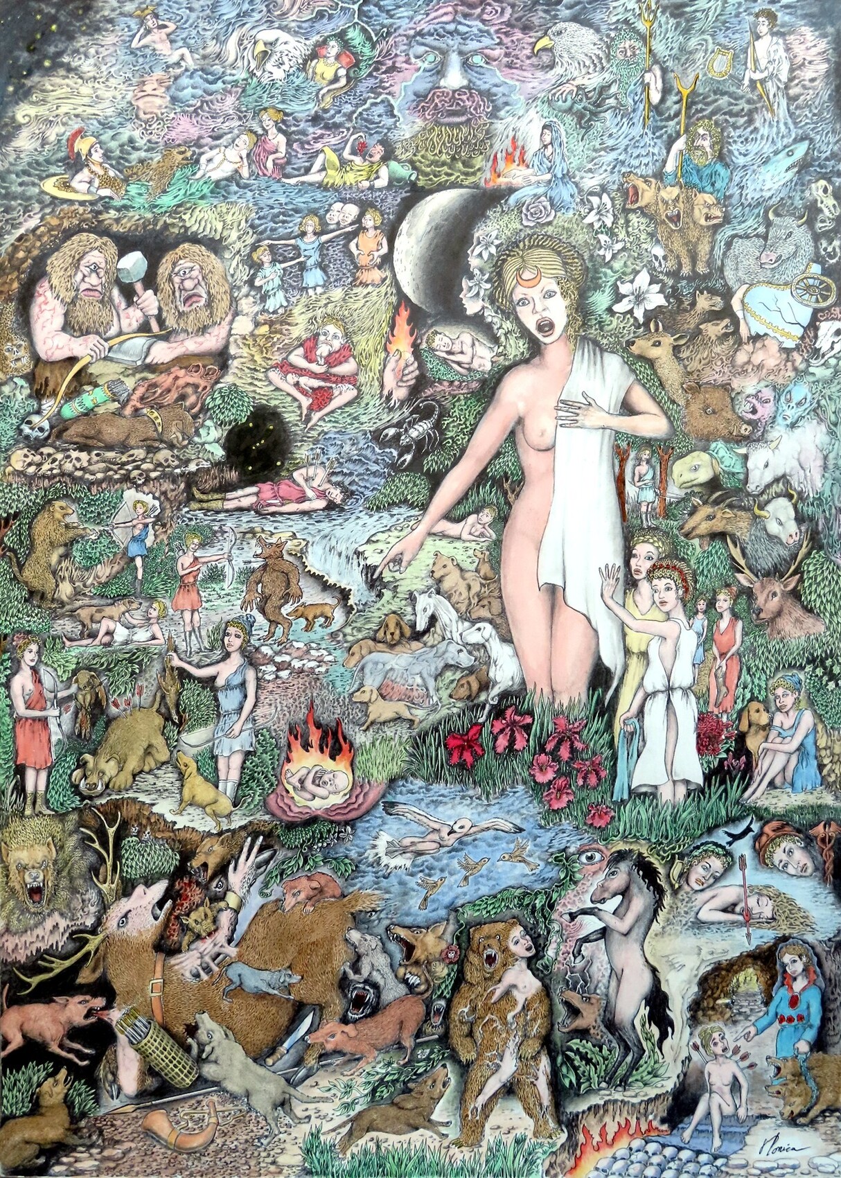 Dessin illustrant la légende d'Artémis et ma vision de la fin du chasseur prétentieux Actéon, changé en cerf par Artémis pour l'avoir volontairement surprise nue prenant son bain et qui fut mis en pièces par ses propres chiens qui ne le reconnaissaient plus.