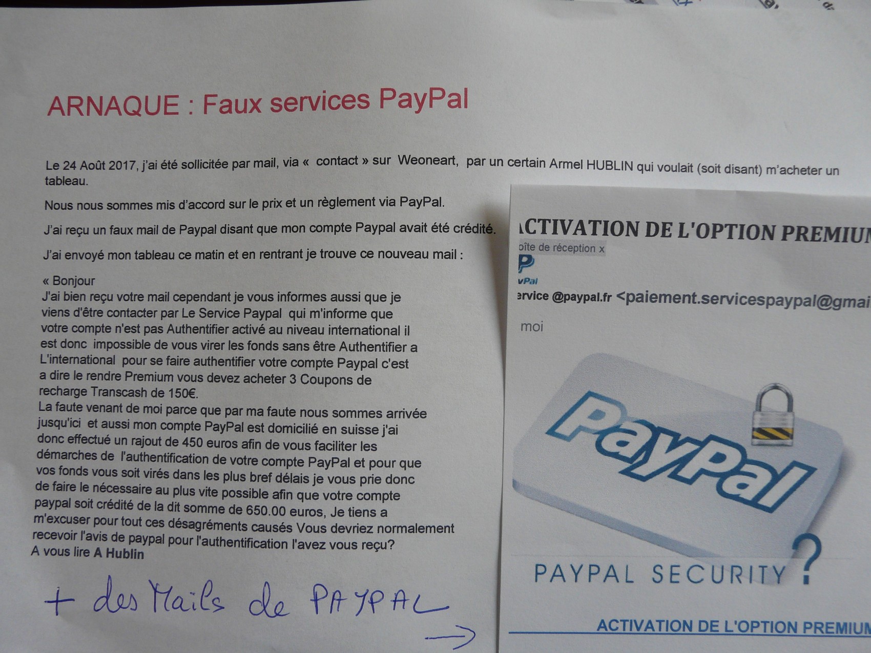 Bonjour J'ai été contactée par le même Armel Hublin. Au moment d'envoyer mon tableau à la poste (pour avoir le numéro de tracking) le guichetier m'a mise en garde me disant qu'il y avait souvent des arnaques avec Paypal. En vérifiant je me suis rendue compte que le message ne venait pas du vrai Paypal, je suis retournée à la poste et j'ai pu récupérer mon tableau. Je comprends maintenant à quoi j'ai échappé. J'ai signalé la tentative d'escroquerie au vrai Paypal. J'espère que vous avez fait de même et que ce bonhomme sera mis hors d'état de nuire.