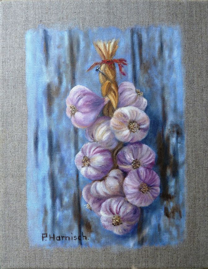 Tresse d'ail sur vieux volet. Huile sur toile de lin,format 24 cm x 30 cm.