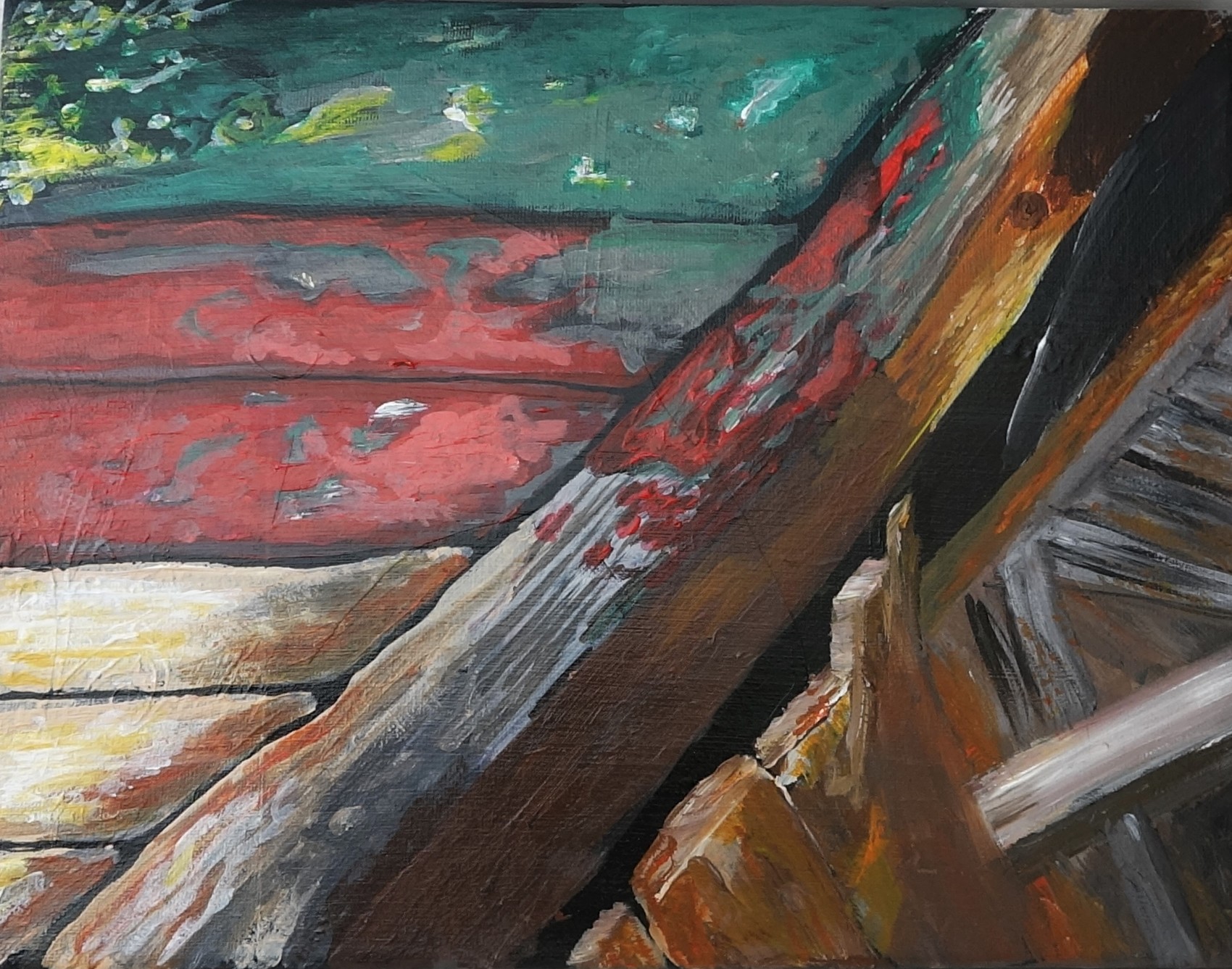 Les peintures s'écaillent sur la coque de ce vieux bateau, perdu dans le Morbihan ! 35x27 cm Acrylique
