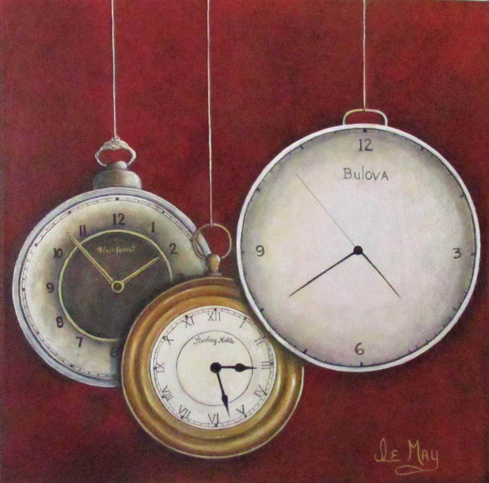 Trois horloges qui marquent les époques, chacune suspendue par un fil ( acrylique 18" X 18" )