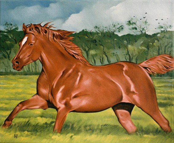 Ce tableau est une commande de 2009. De facture et de style académique, je trouve ce cheval plein de force. Mais aujourd'hui je pense que le cadrage est trop serré, ce qui l'étrique un peu... Et malgré le paysage derrière lui, on n'arrive pas vraiment à ressentir un sentiment de liberté dans ce tableau... L'art se joue parfois à pas grand chose, une couleur, un cadrage...