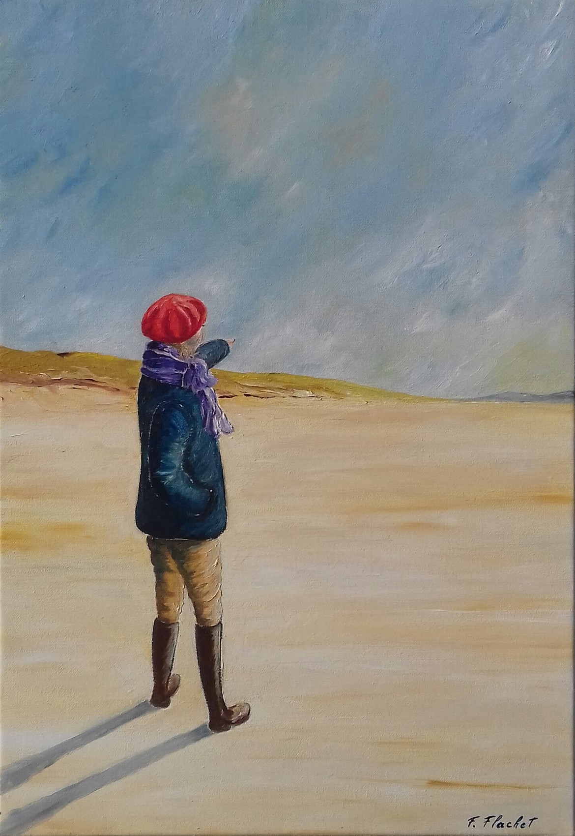 Une femme sur une plage... Elle aperçoit quelque chose au loin... (Huile sur toile 38x55)
