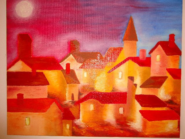 Un petit bourg se réveille, auréolé des couleurs rosées du petit matin. Huile sur toile, 50x40 cm, 2012