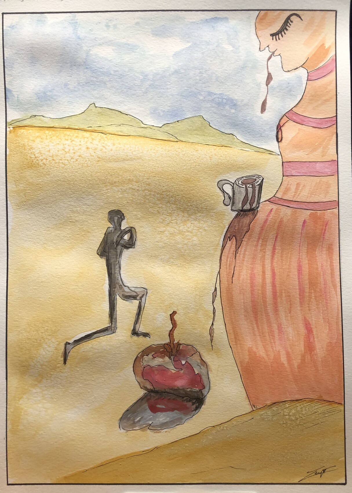 modeste copie d’une œuvre de Dali dont le nom m’a échappé merci de me le rappeler pour les amateurs qui le reconnaissent aquarelle format A3