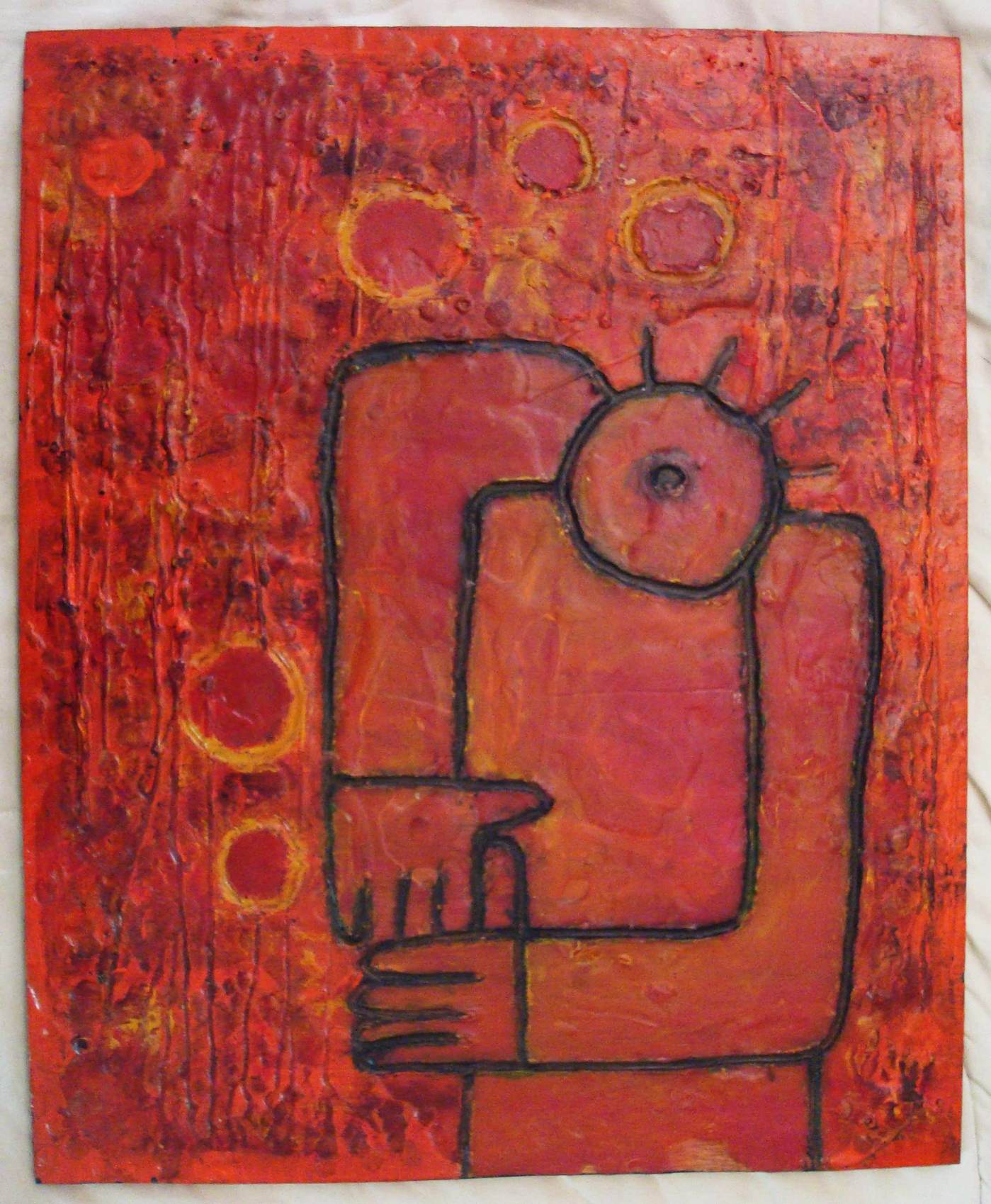 "Cyclope rouge" Tableau 48x40 cire et acrylique sur bois. Dommage que les effets de matière et de transparence donnés par la cire ne se voient pas sur la photographie du tableau...