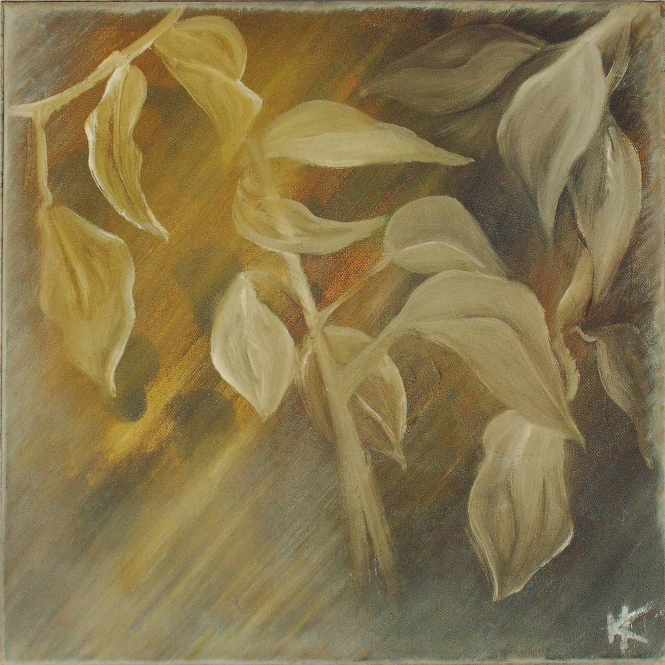 40x40-huile-2006 feuilles automnales représentées avec un rendu opaque par endroits ou bien par transparence à d'autres, permettant un jeu de couleurs;ces dernières,à l'image d'un caméléon changent selon la couleur de fond,baignant dans une lumiére automnales.