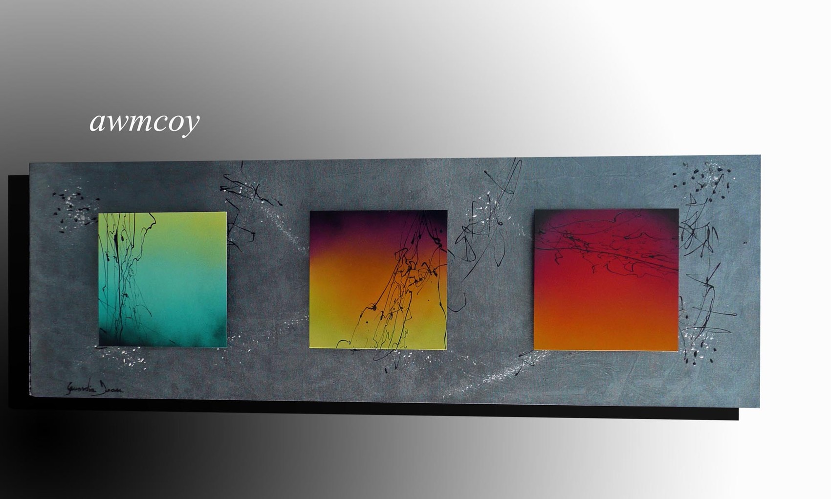 gris métal texturé +dripping noir et blanc avec plaques et couleurs douces et reposantes ....