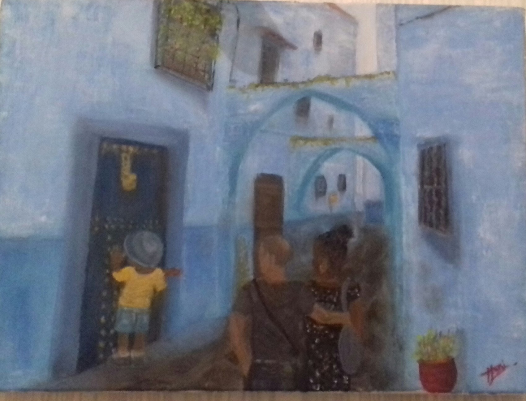 Peinture à l'huile, Toile en coton sur châssis. 33x28cm.technique, couteau et pinceau. Le bleu de majorelle domine forcément cet peinture qui représente un couple et leur enfant dans les ruelles de chefchaouen.