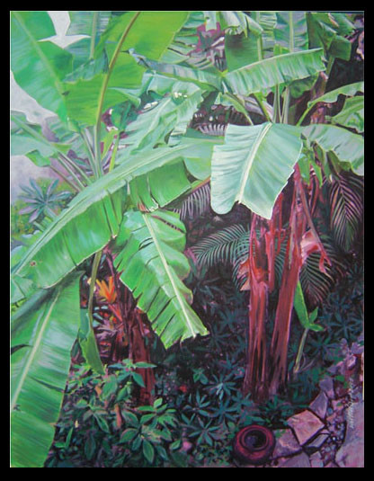 J'ai cru à une photo ! Le côté peinture se ressent dans l'angle en bas à droite. Outre la grande qualité technique, pourquoi ce cadrage avec les feuilles de bananier coupées comme pour une photo ? Pourquoi pas une composition picturale ?