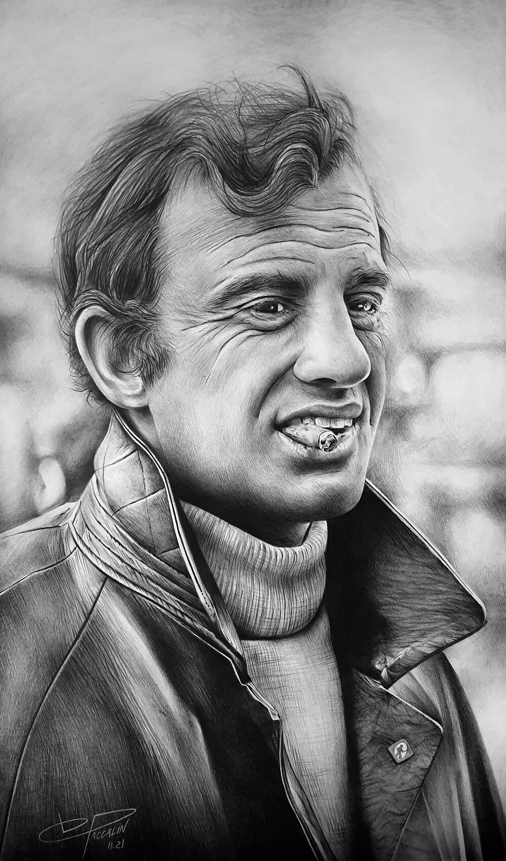 Portrait de Jean-Paul Belmondo alias l'Animal (d'ou sa présence hommage dans ma galerie d'animaux) Format 65 x 40cm Crayon de couleur noir Faber Castell Environ 30h de dessin Mon premier portrait :) Qui en appellera d'autres j'espère !