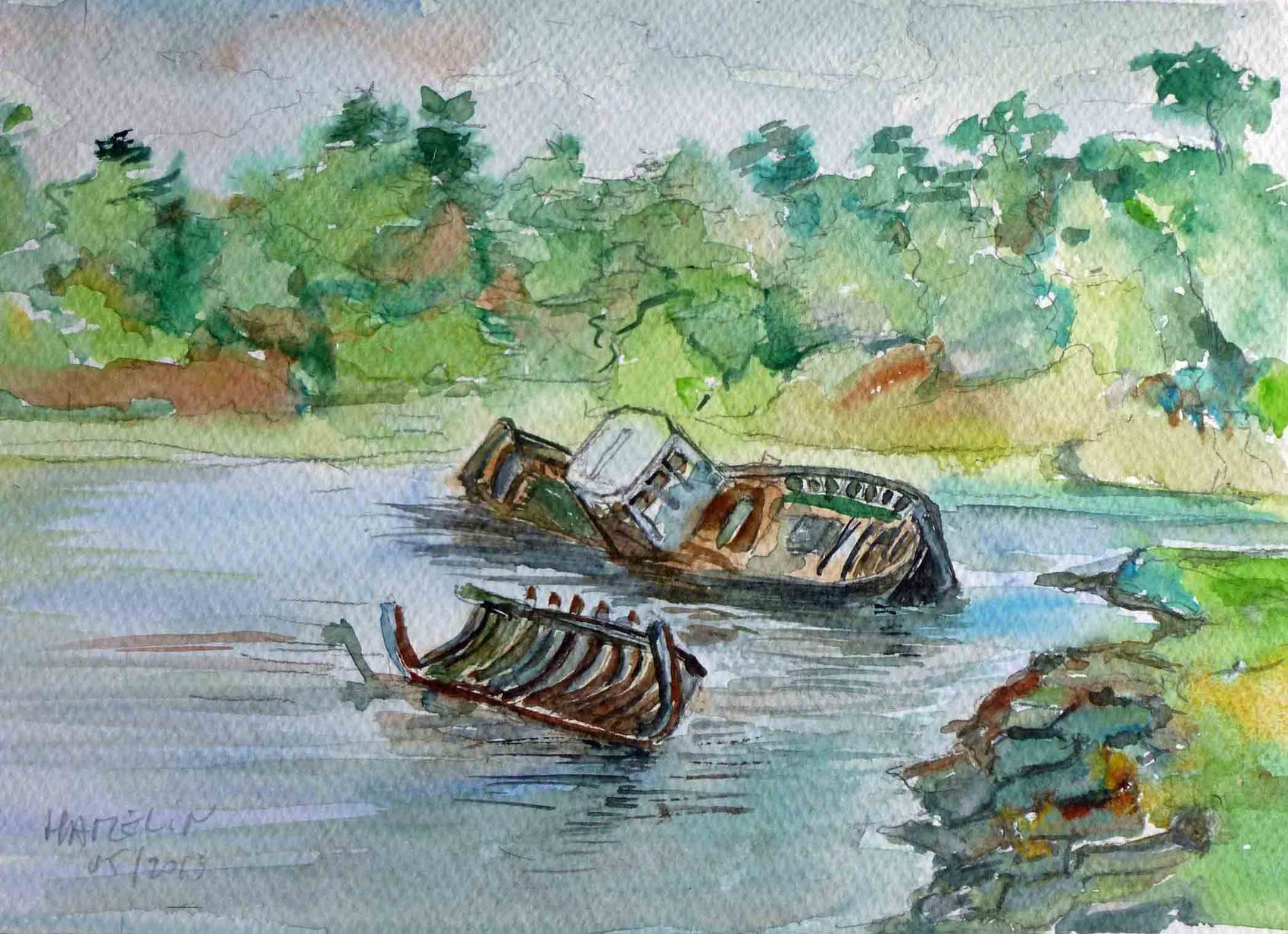 Aquarelle, oeuvre originale 15x20 cm A Bénodet, sur la rivière d'Odet, des carcasses de chalutier se désagrègent au fil du temps. Elle est loin l'époque où fièrement ils chevauchaient les vagues !