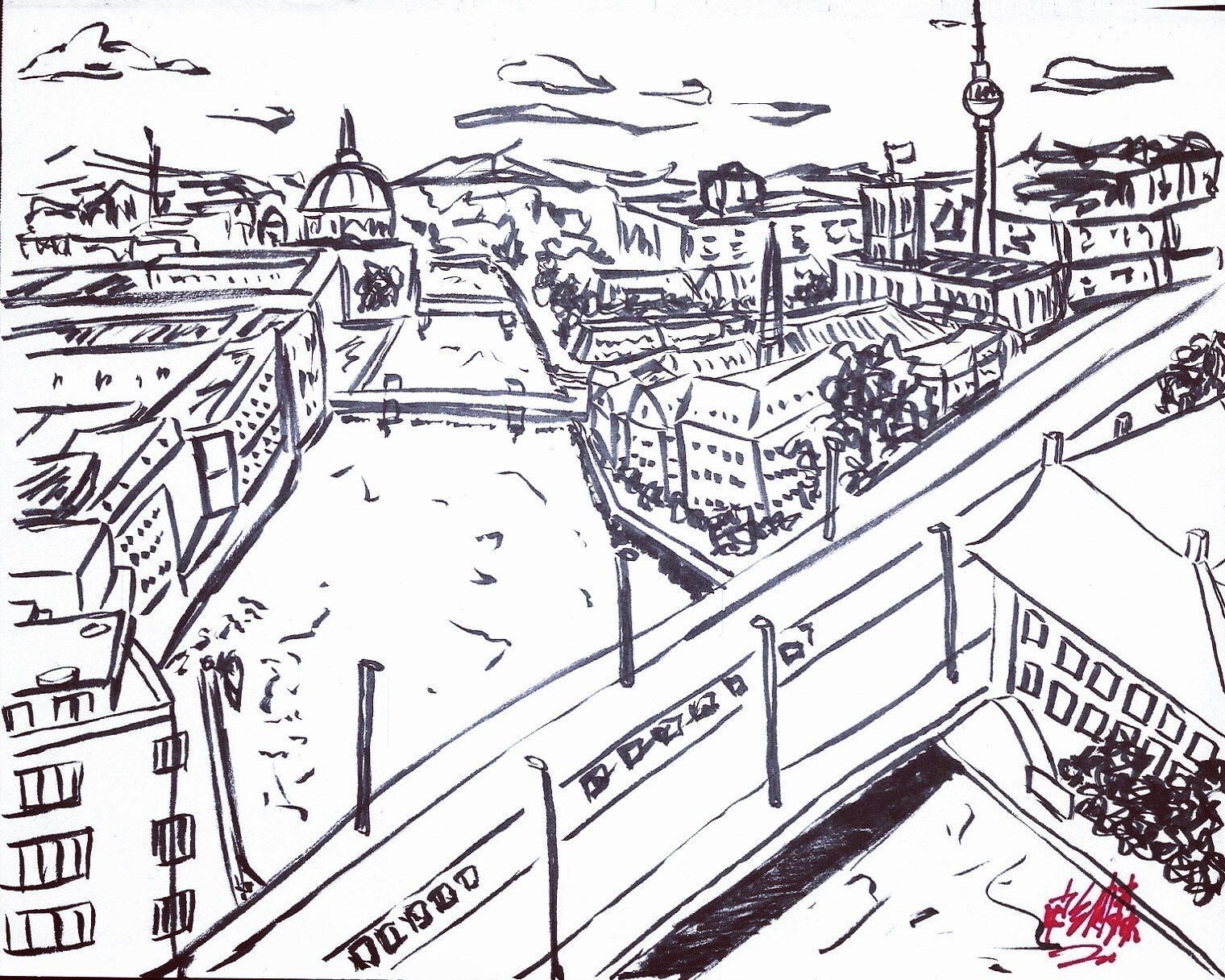 C'est un dessin de la ville de Berlin, en Allemagne. C'est une photo que j'ai prise un week-end à Berlin en 2017. Ce dessin fait partie d'une série d'ouvrages sur les voyages en dessin. Il a été fabriqué avec un feutre pinceau et des marqueurs à l'alcool.