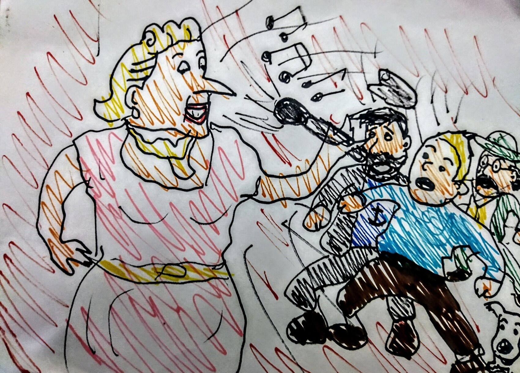je l'entends d'ici!!! beau dessin et on reconnait bien votre style et le fait de gribouiller vos dessins j'aime bien d'ailleurs je regarde a chaque parution vos oeuvres, je mets des coups de coeur mais pas forcément un commentaire alors ce matin j'en met un pour La Castafiore tintin etc.... bonne continuation