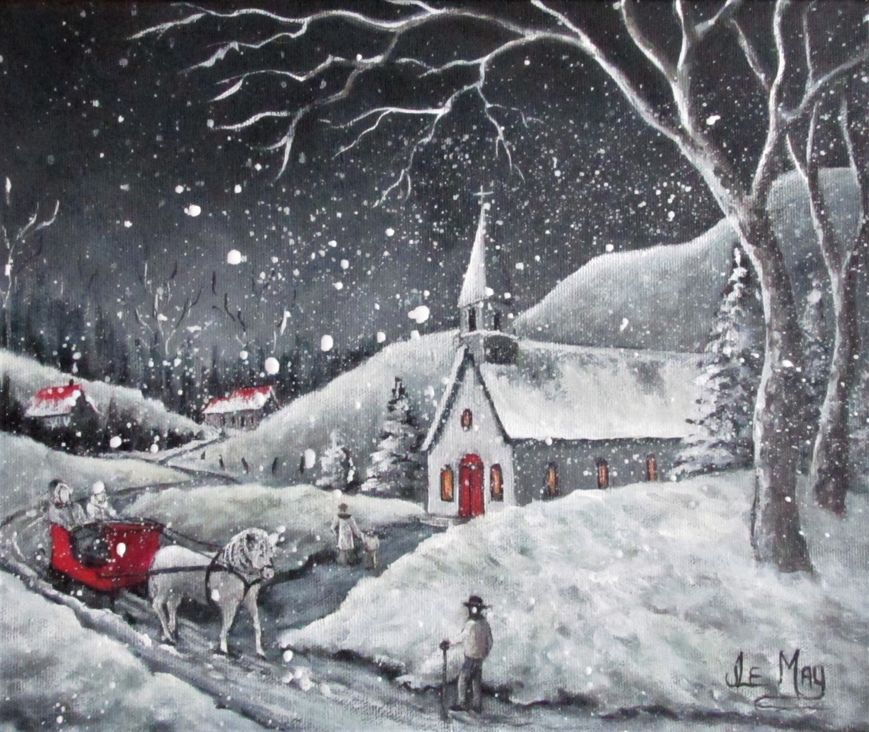La messe de minuit d'autrefois. Les gens du village s'amènent en carriole ou à pied pour la célébration de la messe de minuit avant d'aller réveillonner chez la parentée !