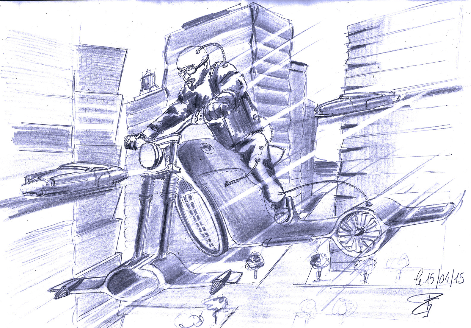 Format A3. Mine de ^plomb et numérisation. Homme au guidon d'une moto rétro néo futuriste.