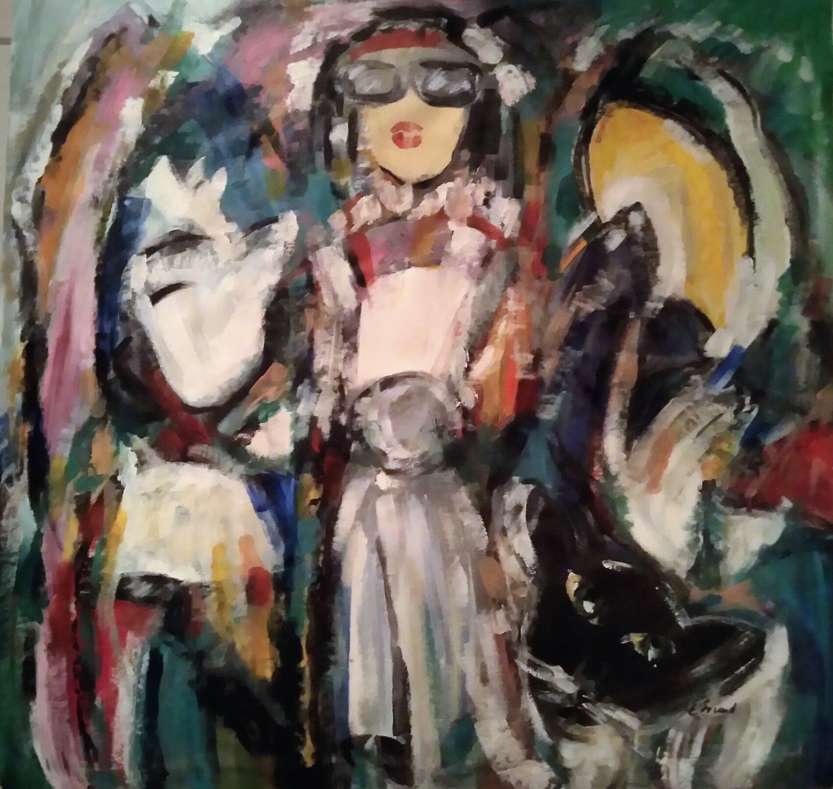 Bonjour Eliart, Est-toi la Star ou la mariée avec des lunettes de soleil précédée d'un maître de cérémonie ou de ton mari sur cette œuvre? Pour un tableau presque figuratif, pourrais tu t'expliquer sur ce que tu as voulu signifier pat cette sorte de phallus noir sur la droite? Le fantasme de la mariée peut-être? Lol et quoiqu'il en soit, bon dimanche.