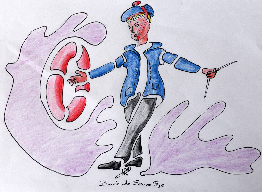 Bouée de sauvetage avec marin en équilibre sur le pont du navire qui tangue sous l'effet des vagues, crayon sur papier A4