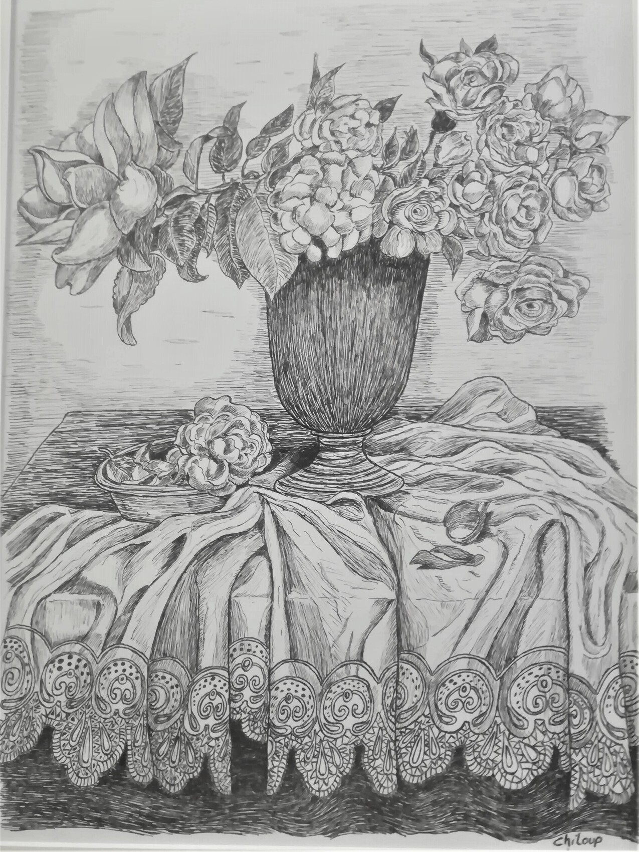 Très beau travail, tant sur les fleurs que sur la nappe. Bravo.
