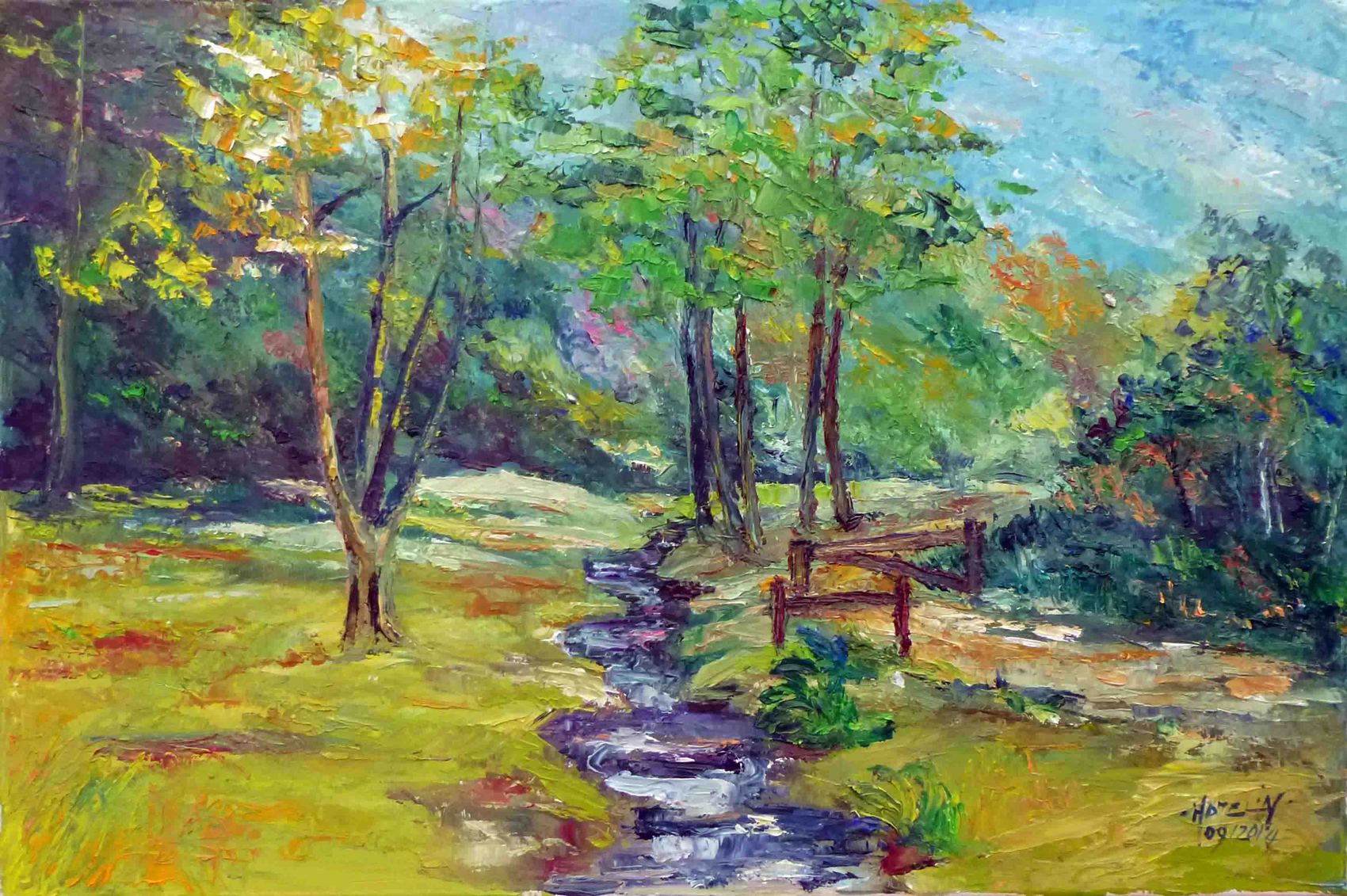 Huile sur toile travaillée au couteau, œuvre unique. 40x60 cm Dans le vallon de Stang Alard à Brest, au milieu du jardin conservatoire serpente un ruisseau