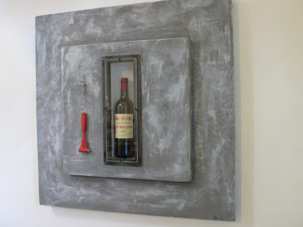 Bois, béton ciré, verre et cadre intérieur métal. Vendu avec la bouteille (en cave pour le moment)