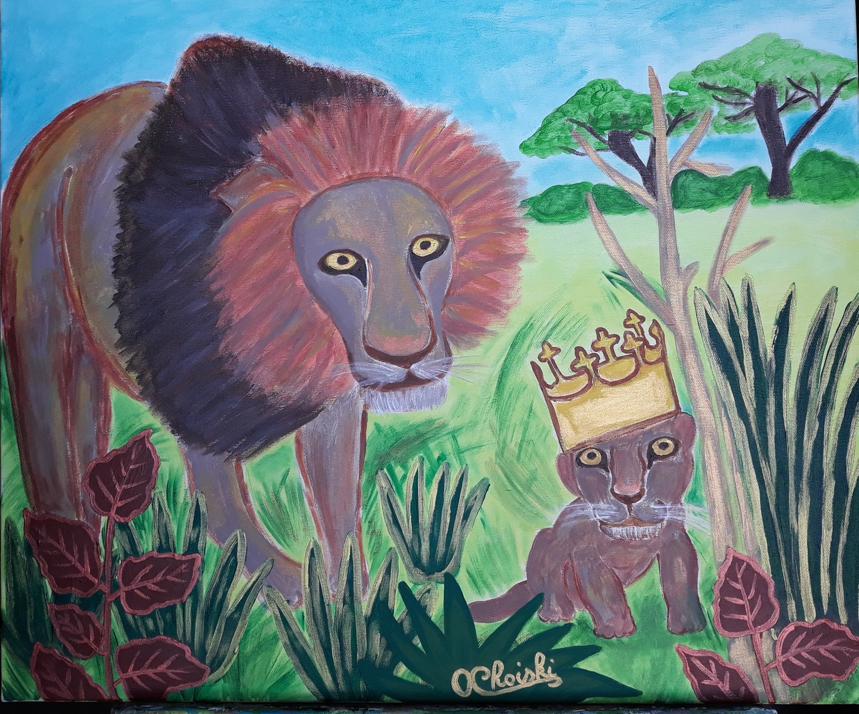 Lion avec son lionceau , mais qui se prends pour le roi? Peinture acrylique Toile 65 x 54 cm