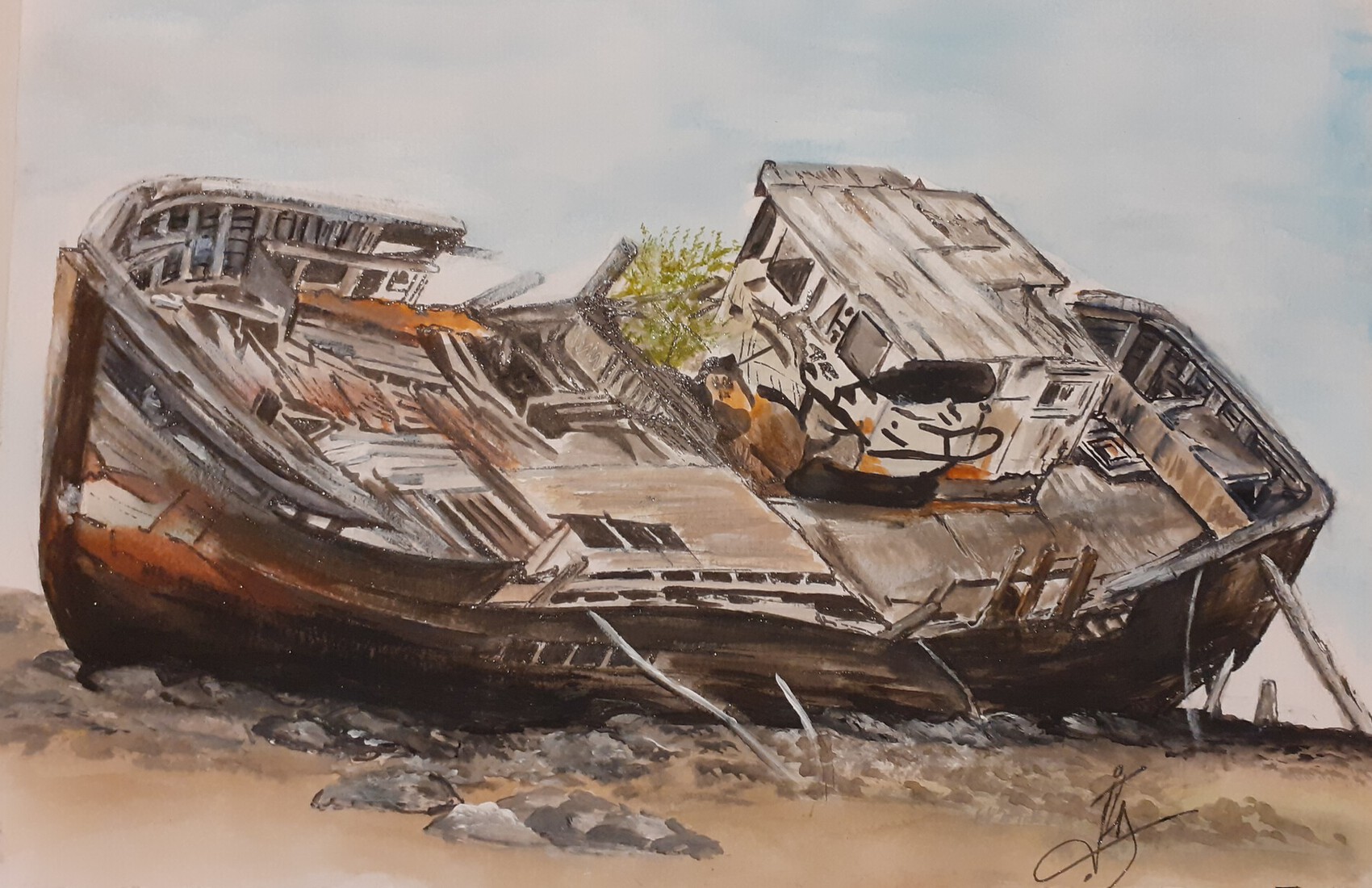 Aquarelle d'un cadavre bateau sis au cimetiere de Quelmer en Bretagne (du coté de la Rance), alentours St Malo