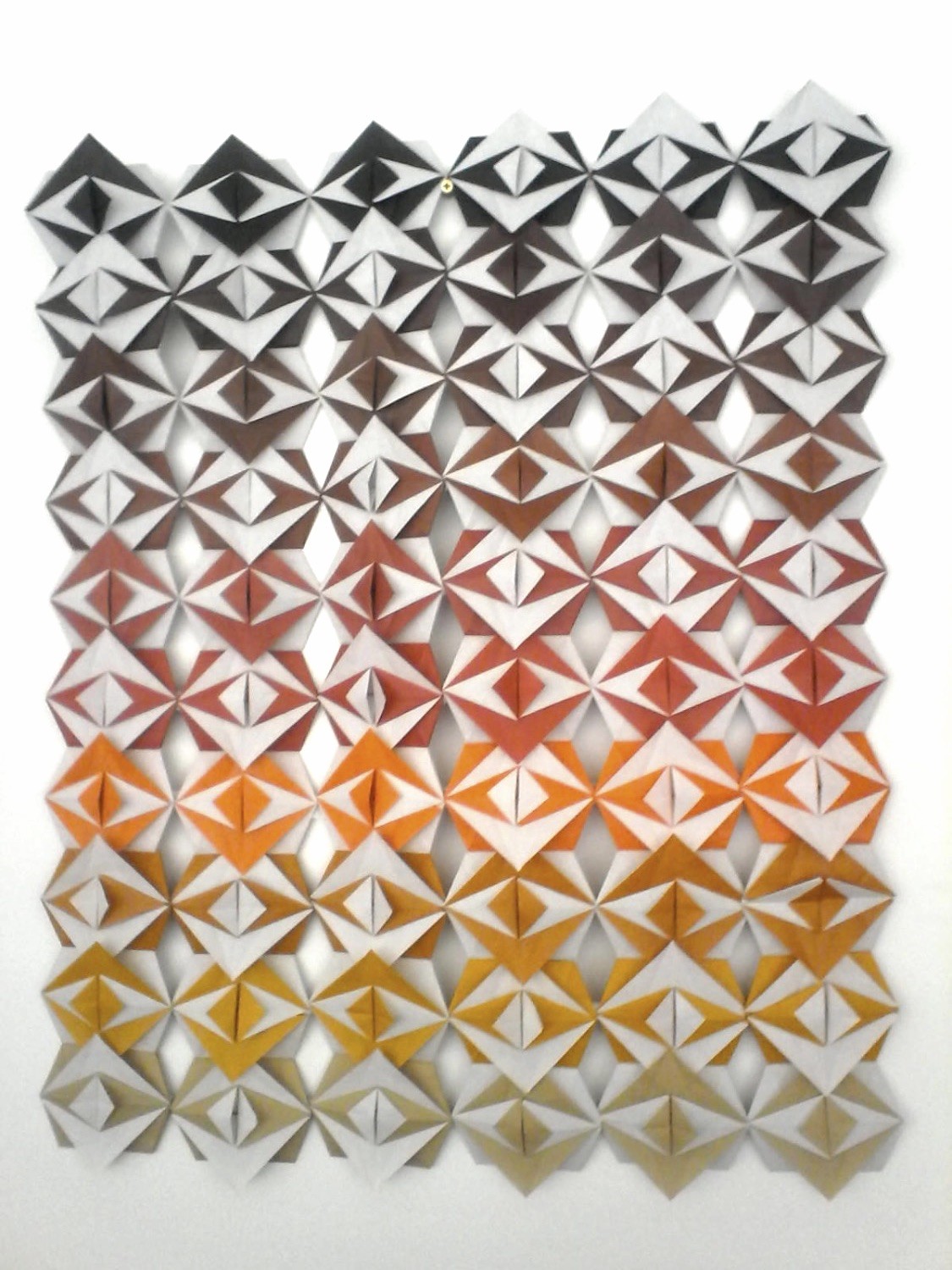 60 pliages d'origamis géométriques. Le tableau mesure 50 cm x 65 cm. J'ai encore utilisé du papier kami japonais pour composer cette mosaïque. Chaque pièce est un "tato". Le tato est un pliage traditionnel japonais. C'est une petite enveloppe servant à l'origine à transporter de petits objets (aiguilles, pièces de monnaie...). Cela pouvait servir aussi à écrire un message à l'intérieur.