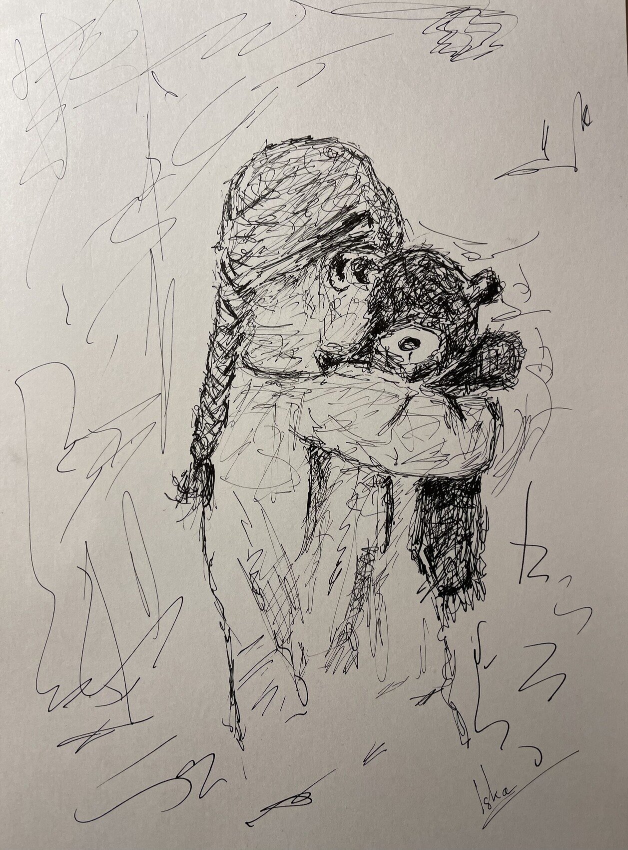 Câlin du matin Fillette avec sa peluche Tresse Bristol feutre liner A4
