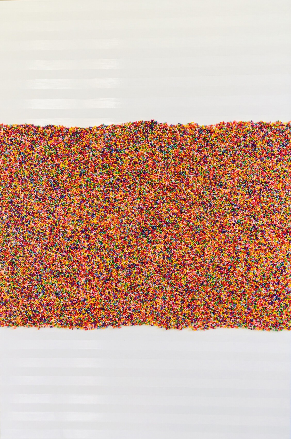 Média mixte sur toile. Mastic, acrylique, aérosol, vernis et billes de polystyrène colorées. Datée et signée, œuvre unique. Toile de 78x42 cm.