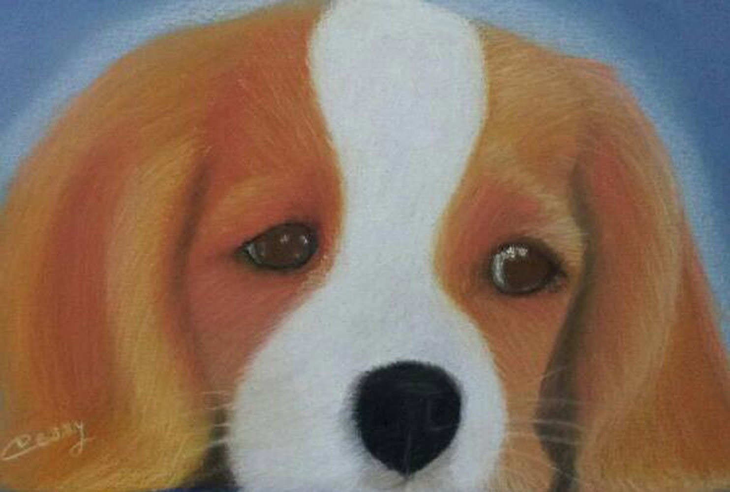d'après photo d'un Cavalier King Charles trouvée sur internet crayons pastel sur papier canson bleu 18X24 cms