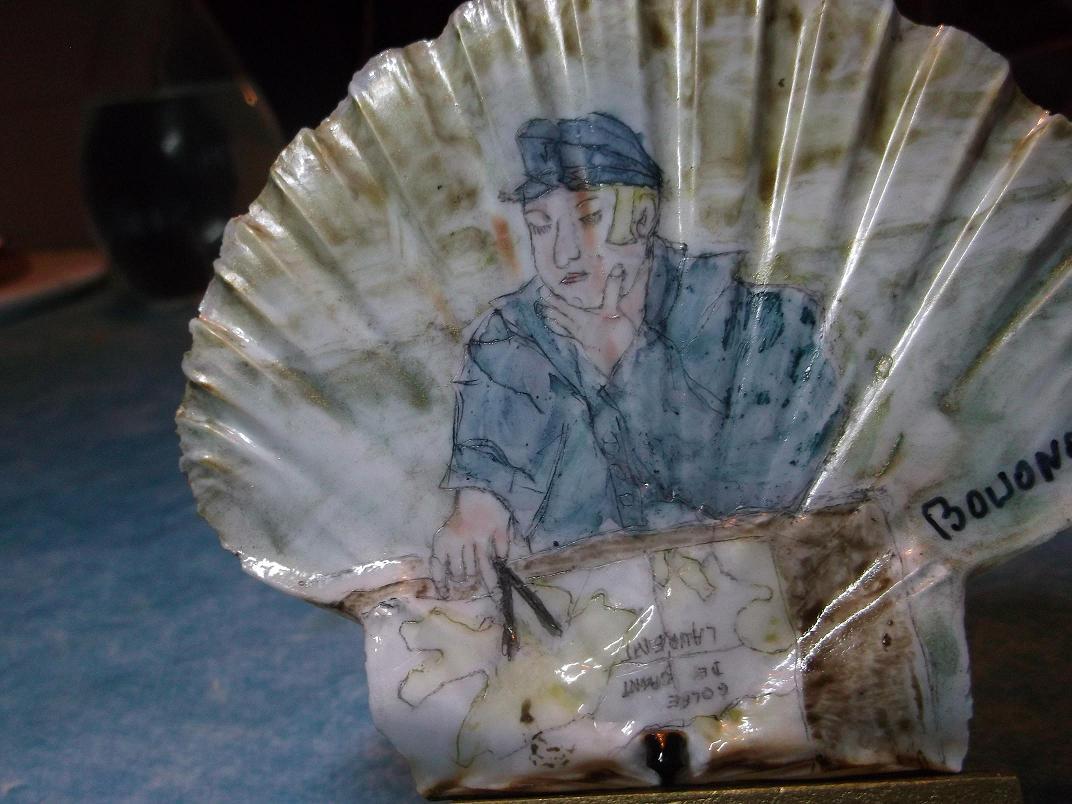 Scrimshaw sur coquille st Jacques Gravé à la main et coloré à l'encre de chine