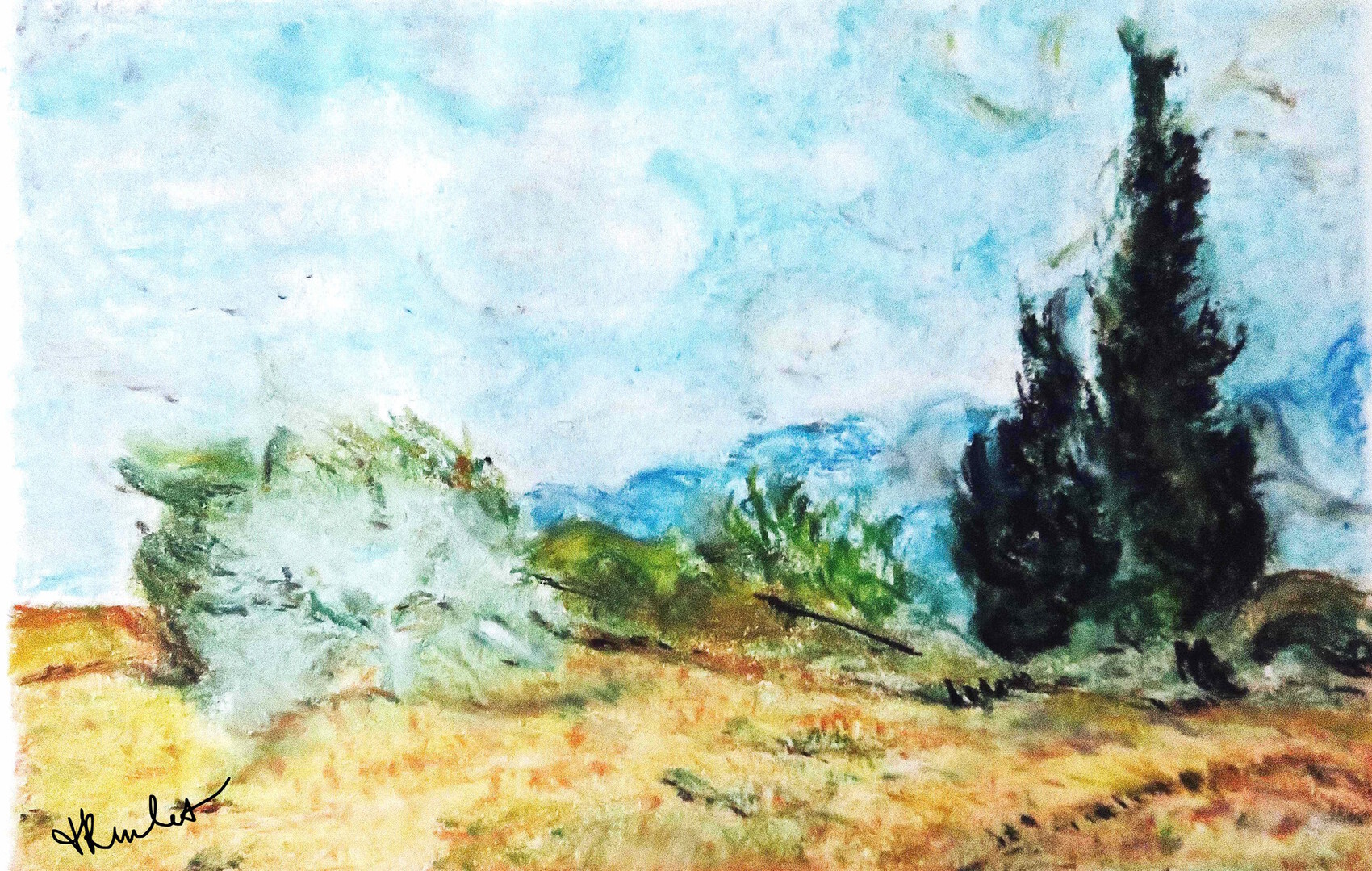 Pastel sec, février 2013, 14 x 21 cm. J’ai choisi ce tableau pour dessiner le mouvement des cyprès. Article sur mon blog Artnaturl = Muriel REULET = Pastel, 2013. I chose this painting to work the movment of the cypresses. You can read the article about this work on my blog Artnaturl.
