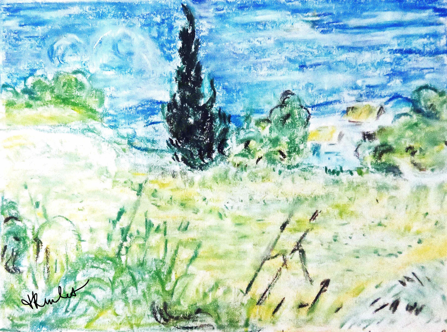Champ de blé vert avec cyprès / Drawing Green wheat field with cypress