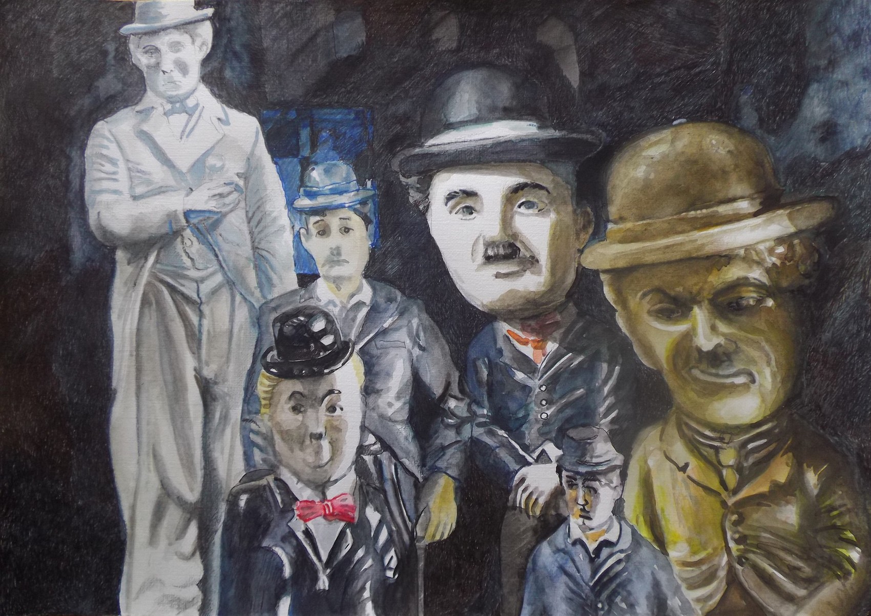 Aquarelle, lavis et feutre sur papier, 29,5 X 42 . Série de trois dessins autour du personnage de Charlot et de ses représentations sous forme de figurines.