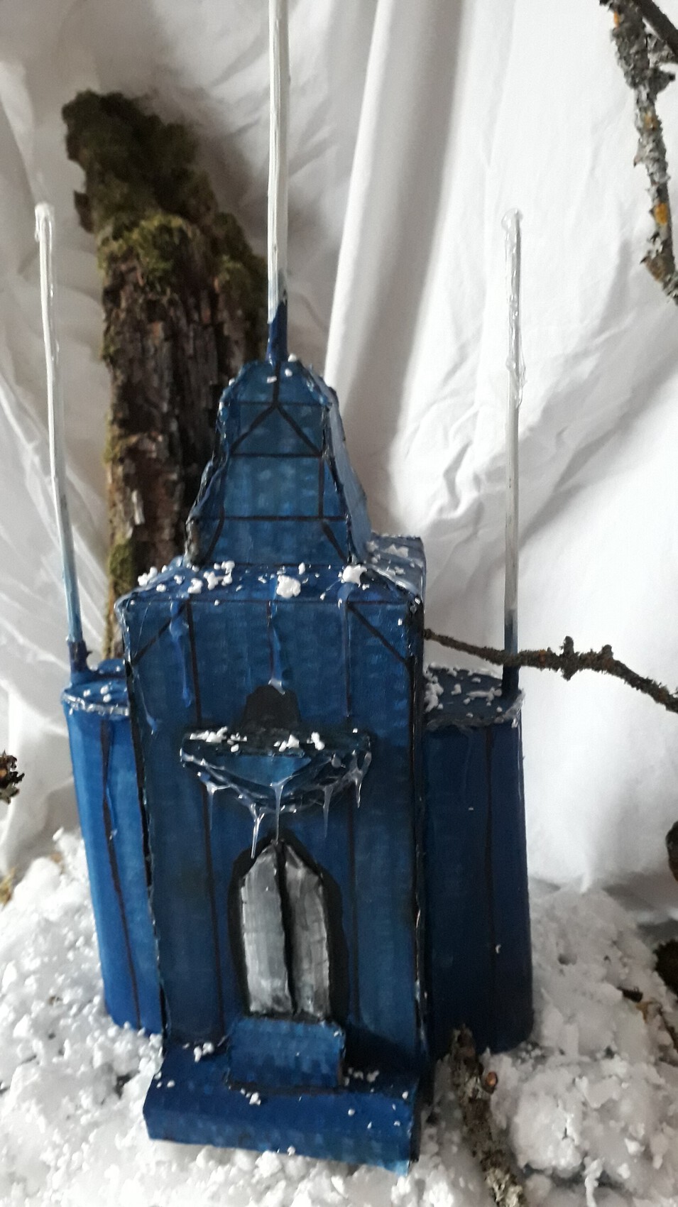 Sculpture d'un château de glace fait en carton, peinture, polystyrène et colle chaude.