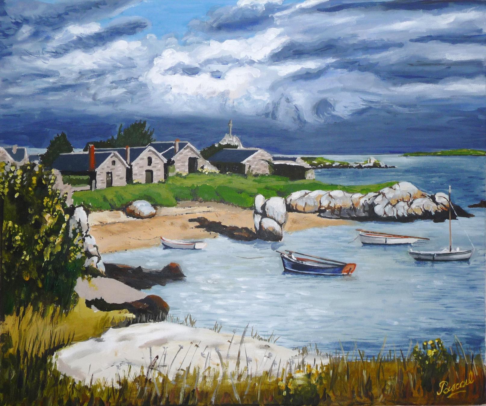 Petit hameau adorable de pêcheurs sur la Grande-ile des Chausey.Marine mer bateau port. acrylique sur toile 55 X 45