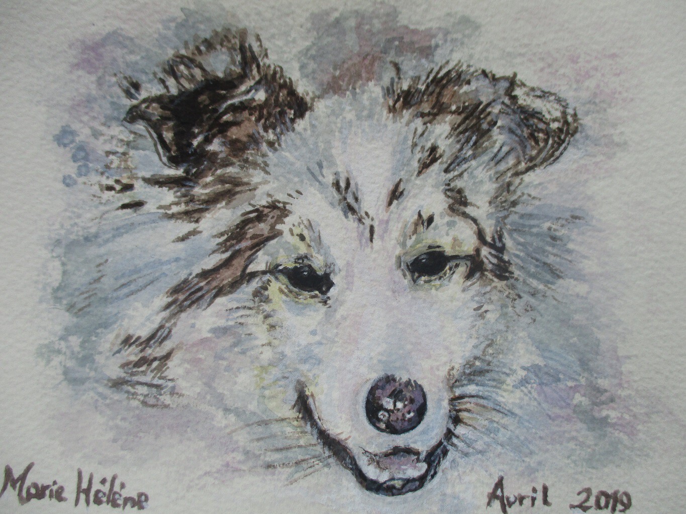 Aquarelle sur papier aquarelle - format 18 x 24 cm - Clin d'oeil au film avec Kevin Kostner dans son film "Danse avec les loups et son loup "Chaussette", que j'ai adoré. D'après photographies.