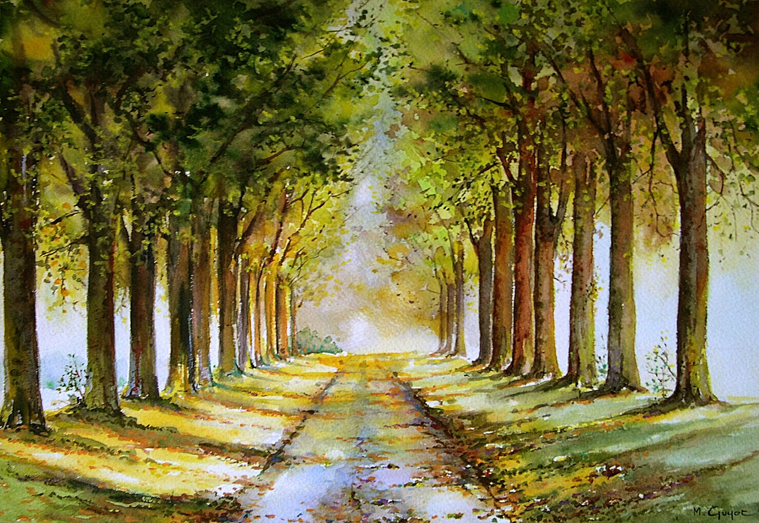 Allée boisée dans la brume. Aquarelle.