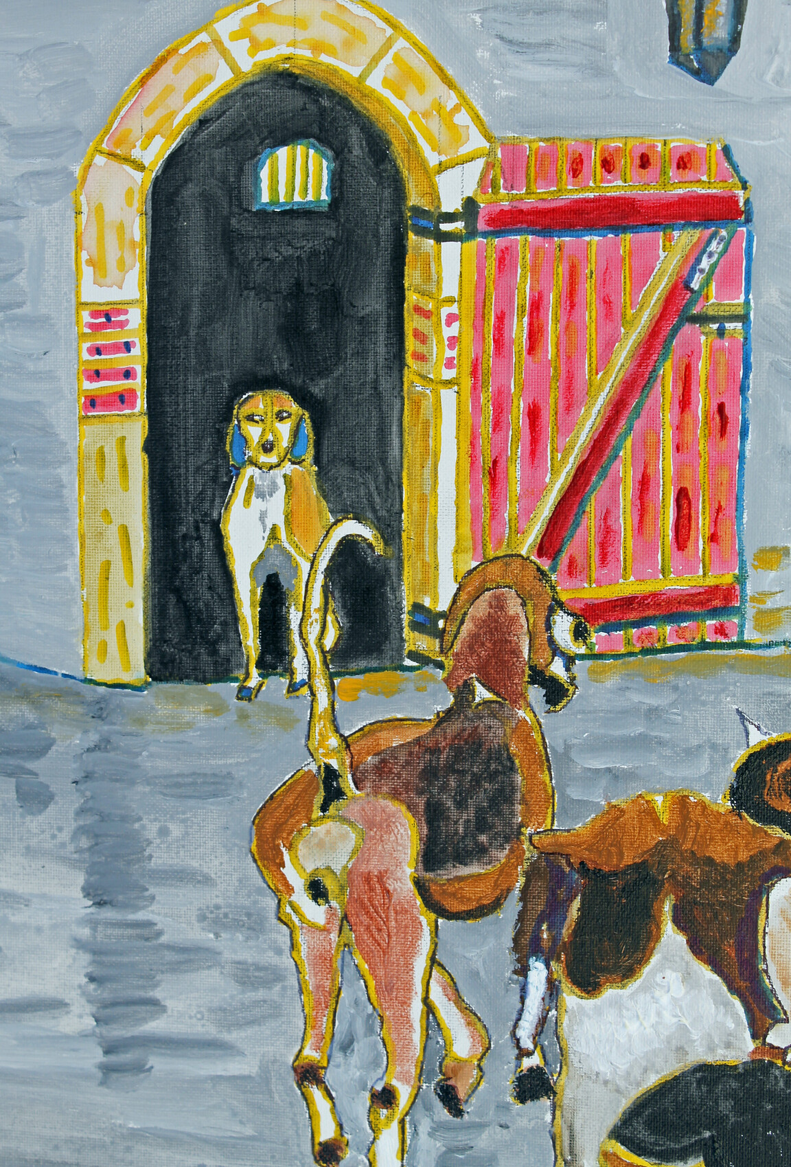 Chenil situé dans le chateau de Cheverny:chiens de chasse à courre: peinture sur bois à l'acrylique:oeuvre originale effectuée en 2018: dimensions: hateur=30 cm: largeur=24cm: teinte dominante bleu-gris
