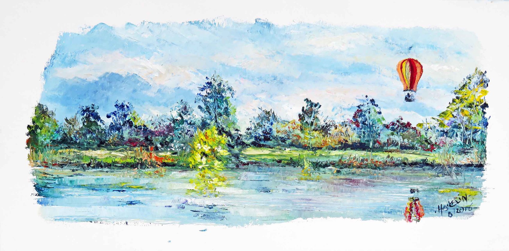 Huile sur toile, esquisse au couteau; œuvre unique de 30x60 cm. Les eaux du Cher près de Chenonceau sont calmées et apaisées pour regarder l'envol tranquille des montgolfières.
