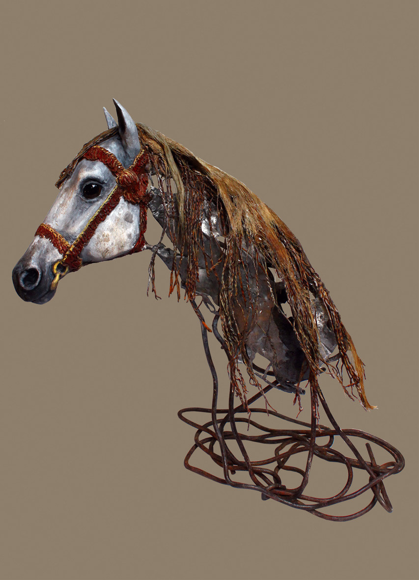 Sculpture tête de cheval: fer, papier mâché, lin, étain.