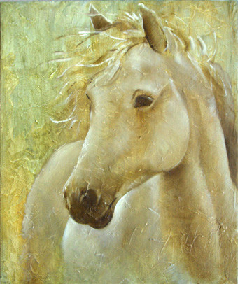 Peinture naturaliste d'un cheval blanc en sur fond ocre vert patiné avec des effets de matières. Son regard plein de douceur et de vie lui confère une profonde humanité. Format : 38 x 45,5 cm http://elvis.magalhaes.free.fr