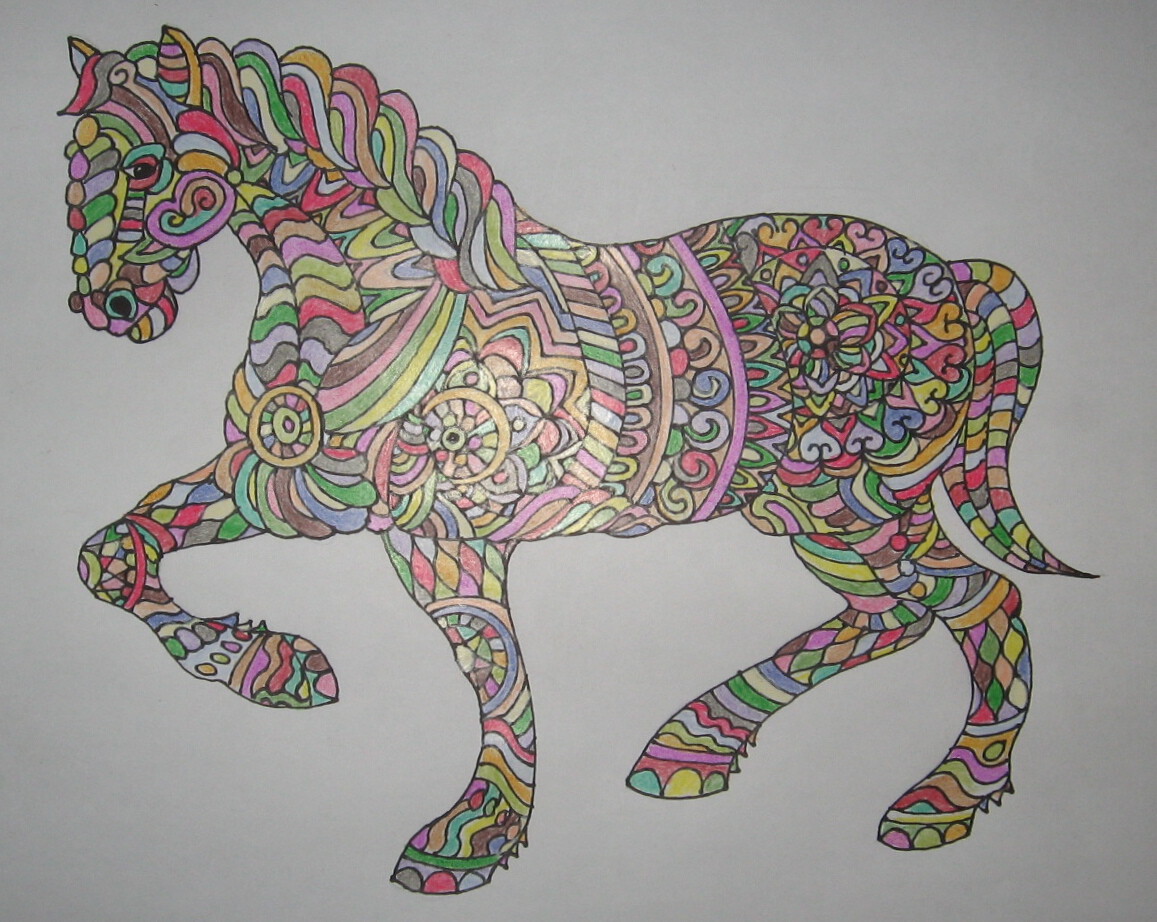 Dessin au crayon de feutre noir et crayons de couleurs.
