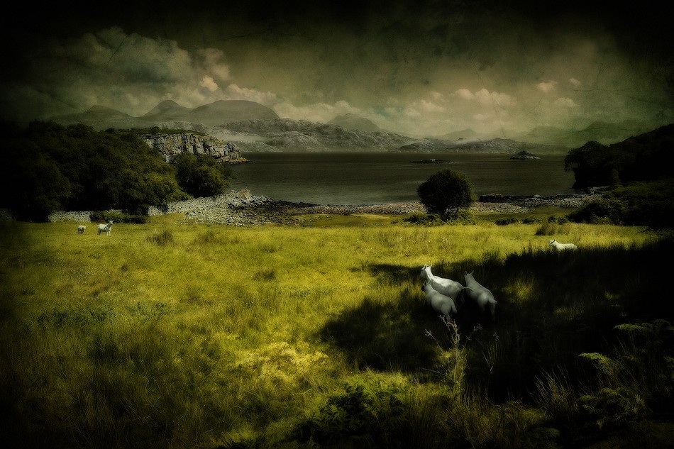 Photographie d'un paysage écossais traitée avec vignetage, textures et accentuations diverses. (2010)