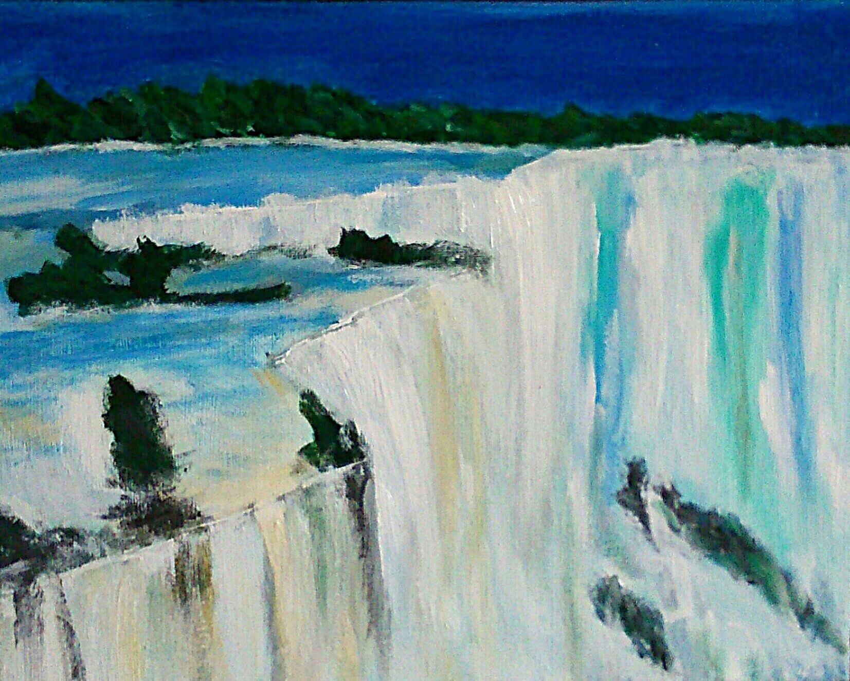 Chutes d’eau. Acrylique, toile sur châssis 24 × 30 cm. Les chutes d'eau fascinent par leur puissance et leur grâce. Le tumulte de l'eau qui se jette dans le vide évoque à la fois la force brute de la nature et une beauté hypnotique. Elles apaisent, inspirent et rappellent que le mouvement est la vie. https://www.artpal.com/cothy-art1