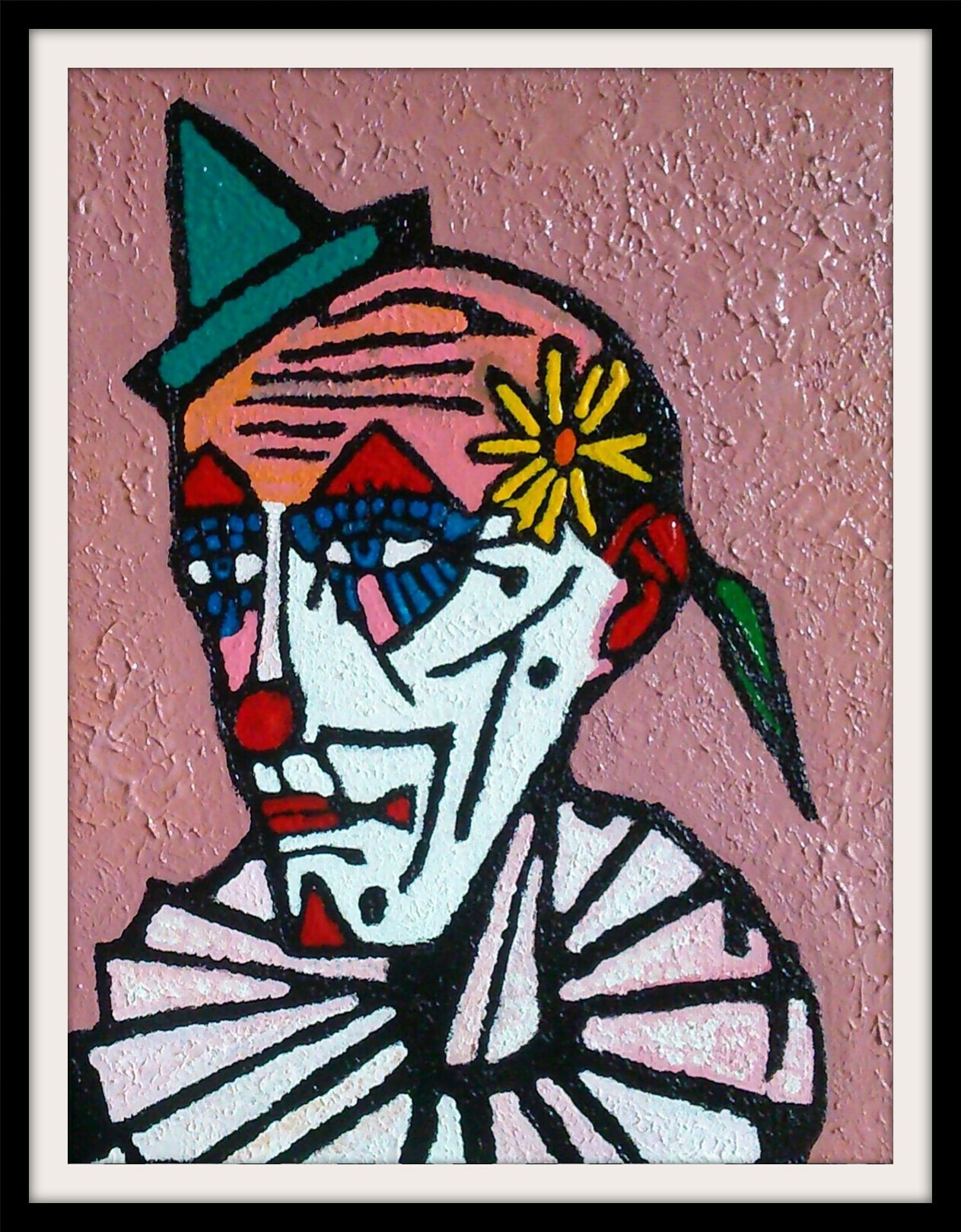 j'adore ce beau clown à la pâquerette. Même sobre, il est élégant qui arbore de magnifiques couleurs. Je lui trouve une pointe de mystère. J'aime beaucoup aussi le fait qu'il occupe bien la toile et le fond rose (comme son crâne, et les différentes touches sur son visage et la collerette) : ça lui apporte de la douceur. Une réussite. Bravo Thierry. Bisous
