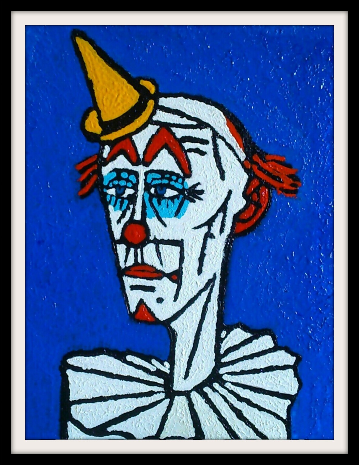 Clown au Chapeau Pointu. Acrylique, toile carton 30 x 24 cm. Hommage à Bernard Buffet. Inspiré d’après Clown au chapeau jaune, 1985. https://www.artpal.com/cothy-art1