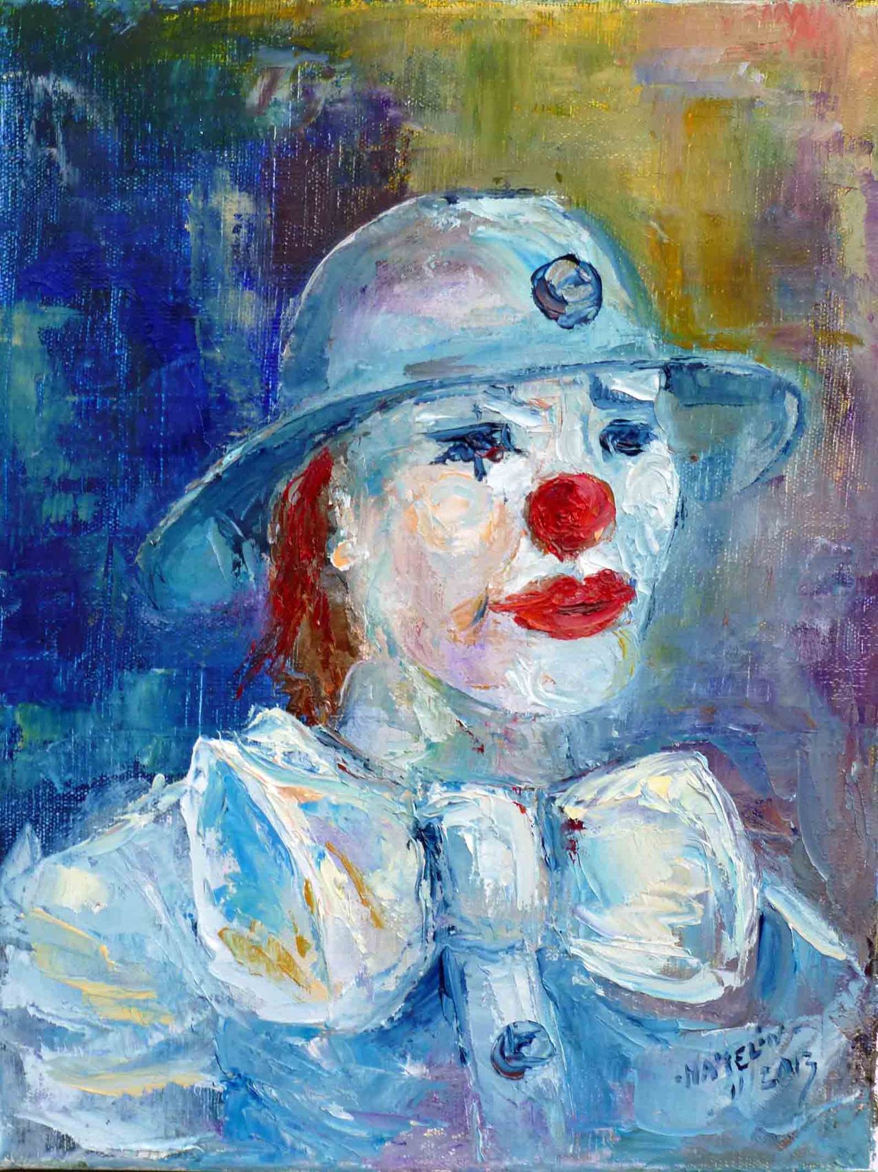 Huile sur toile, oeuvre originale. Un clown en habit et chapeau bleu.